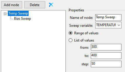 To create a nested sweep, select a parent node before clicking on the Add node button. The new node will be nested below the selected one. (e.g. “BiasSweep”, Figure 1.1.13)