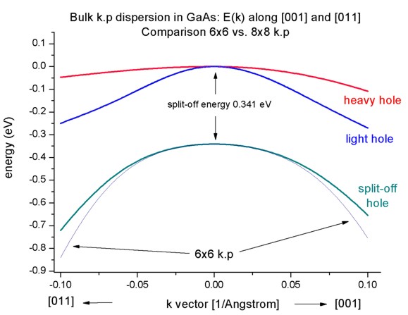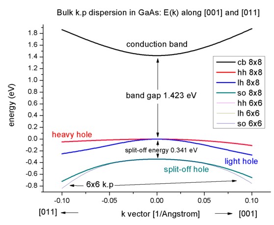 • If one zooms into the holes and compares 6-band vs. 8-band k.p, one can see that 6-band and 8-band coincide for |k| < 1.0 nm-1 for the heavy and light hole but differ for the split-off hole at larger |k| values.