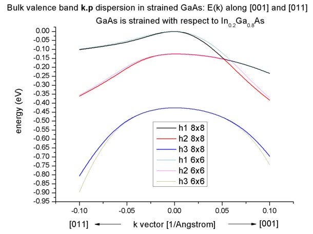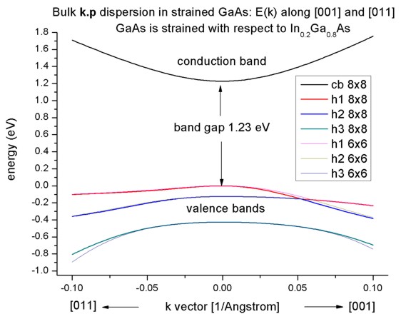 • If one zooms into the holes and compares 6-band vs. 8-band k.p, one can see that the agreement between heavy and light holes is not as good as in the unstrained case where 6-band and 8-band k.p lead to almost identical dispersions.
