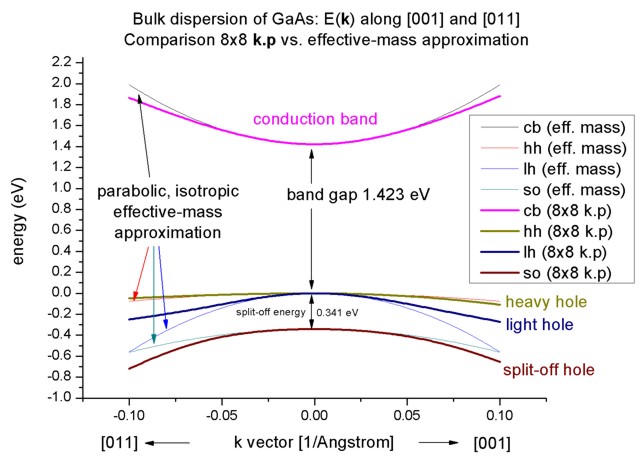 • Now we want to compare the 8-band k.p dispersion with the effective-mass approximation. The effective mass approximation is a simple parabolic dispersion which is isotropic (i.e. no dependence on the k vector direction). For low values of k (|k| < 0.4 nm-1) it is in good agreement with k.p theory.