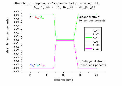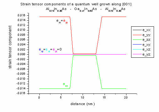 [001] growth direction: The well region is lattice matched to InP, therefore strain is zero. Only the barrier region is subject to strain. The off-diagonal strain tensor components are all zero (exy=exz=eyz=0) as we have [001] growth direction. Al0.70In0.30As has a smaller lattice constant than the substrate material InP (lattice mismatch 1.55 %) leading to tensile strain.