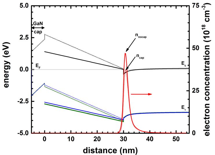 The following figure shows the conduction and valence band edges of an Al0.3Ga0.7N/GaN FET with (solid lines) and without (dotted lines) a 5 nm GaN cap layer.
