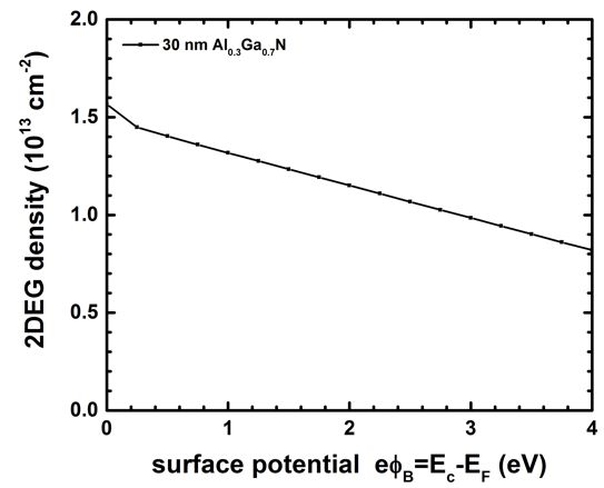 The following figure shows the calculated 2DEG density as a function of Schottky barrier height, i.e. surface potential.