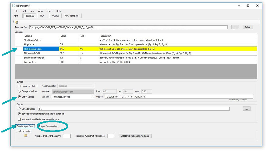 We use nextnanomat's Template feature in order to sweep over the AlxGa1-xN barrier thickness. This is shown in the following screenshot.