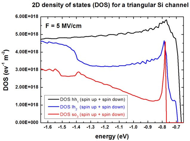 Here, we calculate the density of states (DOS) for the holes in a 10 nm wide Si channel that is modeled by a triangular potential, corresponding to an applied electric field of 5 MV/cm.