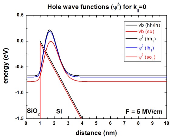 The following figure shows the valence band edges of heavy, light and split-off hole at an electric field of 5 MV/cm.