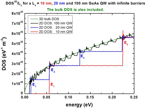1) Electron density of states (DOS) of a GaAs quantum well with infinite barriers