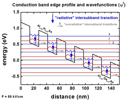 The wave functions (psi²) of this quantum cascade structure are shown.
