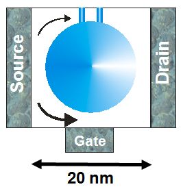 The lower gate is 6 nm long, all other leads are 20 nm long.