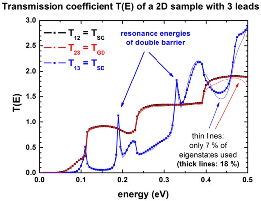 The following figure shows the calculated transmission coefficients of the various lead combinations T12, T23 and T13.