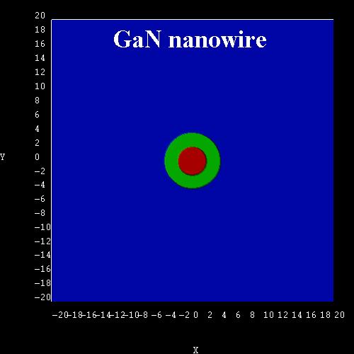 • We assume a cylindrically shaped GaN nanowire (wurtzite structure) that has a radius of 2 nm with infinite barriers so that the wave functions are zero at the nanowire boundary. This assumption is consistent to the above cited paper. The GaN nanowire is shown in red in the following figure. The GaN nanowire is discretized on a mesh with a grid resolution of 0.05 nm.