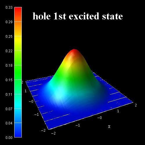 • The following figures show the ground state wave function (psi²) of the hole (left figure) and the 1st excited hole state (right figure) as calculated within the 6-band k.p approximation at k = 0.