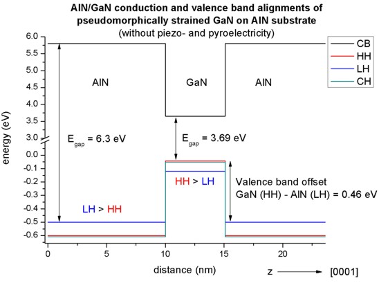 The following figure shows the conduction and valence band edge alignment in AlN/GaN structures (unstrained). In AlN, the light hole (LH) is the highest valence band whereas in GaN, this is the heavy hole (HH). We assumed a valence band offset of VBO = 0.5 eV, the conduction band offset is much larger (CBO = 2.3 eV). All material parameters are based on the paper
